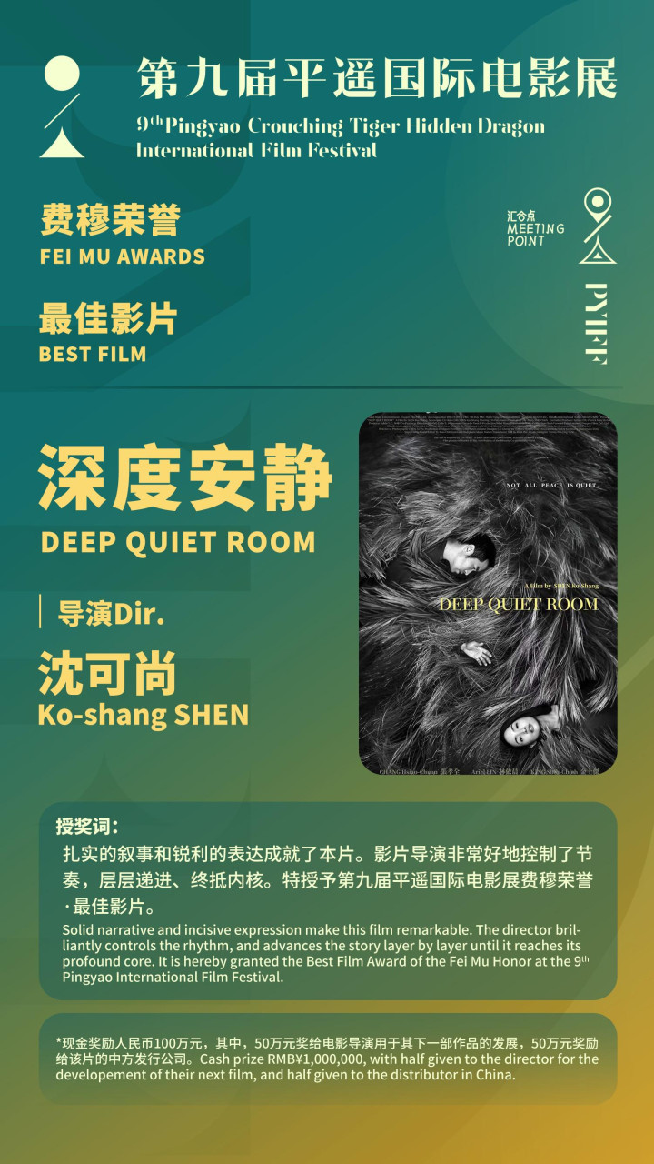 今年“费穆荣誉”评审团包括曹保平、马伊琍和曾国祥等。最终,评审团在11部入围作品中遴选出4部佳作,包揽了所有“费穆荣誉”。来自中国台湾,由张孝全和林依晨主演的《深度安静》获评“最佳影片”,张孝全同时凭借出色的表现摘得“最佳男演员”殊荣;“最佳女演员”大奖颁给了新加坡演员郑凯心(《核》);“最佳导演”大奖由北电保安转型导演的张中臣凭借《你的眼睛比太阳明亮》收入囊中;评审荣誉则授予了纪录片《浪花儿》。